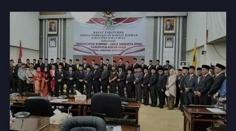 Rokan Hulu—Bupati Kabupaten Rokan Hulu (Rohul) H Sukiman dan Wakil Bupati H Indra Gunawan hadiri pelantikan 45 Anggota Dewan Perwakilan Rakyat Daerah (DPRD) Rohul Periode 2024-2029.