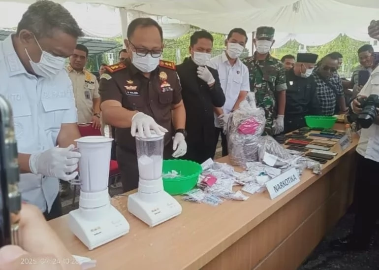 BB Narkotika jenis shabu-shabu di musnahkan dengan cara diblender, daun ganja kering, jenis kain dilakukan dengan dibakar dalam drum, sedangkan tonjok dan jenis besi lainnya serta HP Android dimusyawarahkan dipotong-potong menggunakan mesin gerinda.