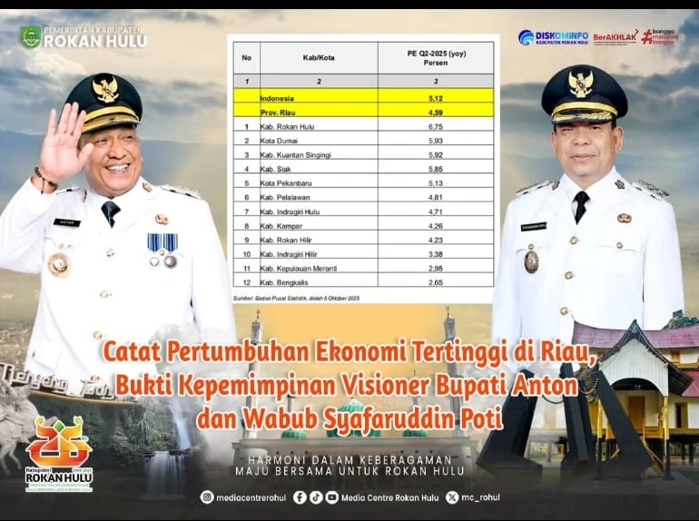 Angka tersebut tertuang dalam rincian Pertumbuhan Ekonomi Kabupaten/Kota se-Provinsi Riau Triwulan II (Year on Year), di mana capaian Rokan Hulu melampaui rata-rata provinsi yang berada di angka 4,59 persen dan juga di atas rata-rata nasional sebesar 5,13 persen.